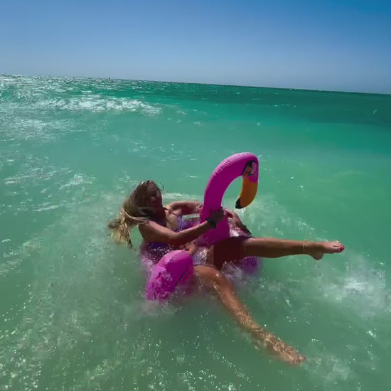 Let your style take flight with the Glitter Flamingo Pool Tube from PoolCandy! This bright and beautiful bird will add color and comfort to your next pool party. The 36" Glitterfied® tube is filled with pink holographic glitter that shines and changes color in the sun.
